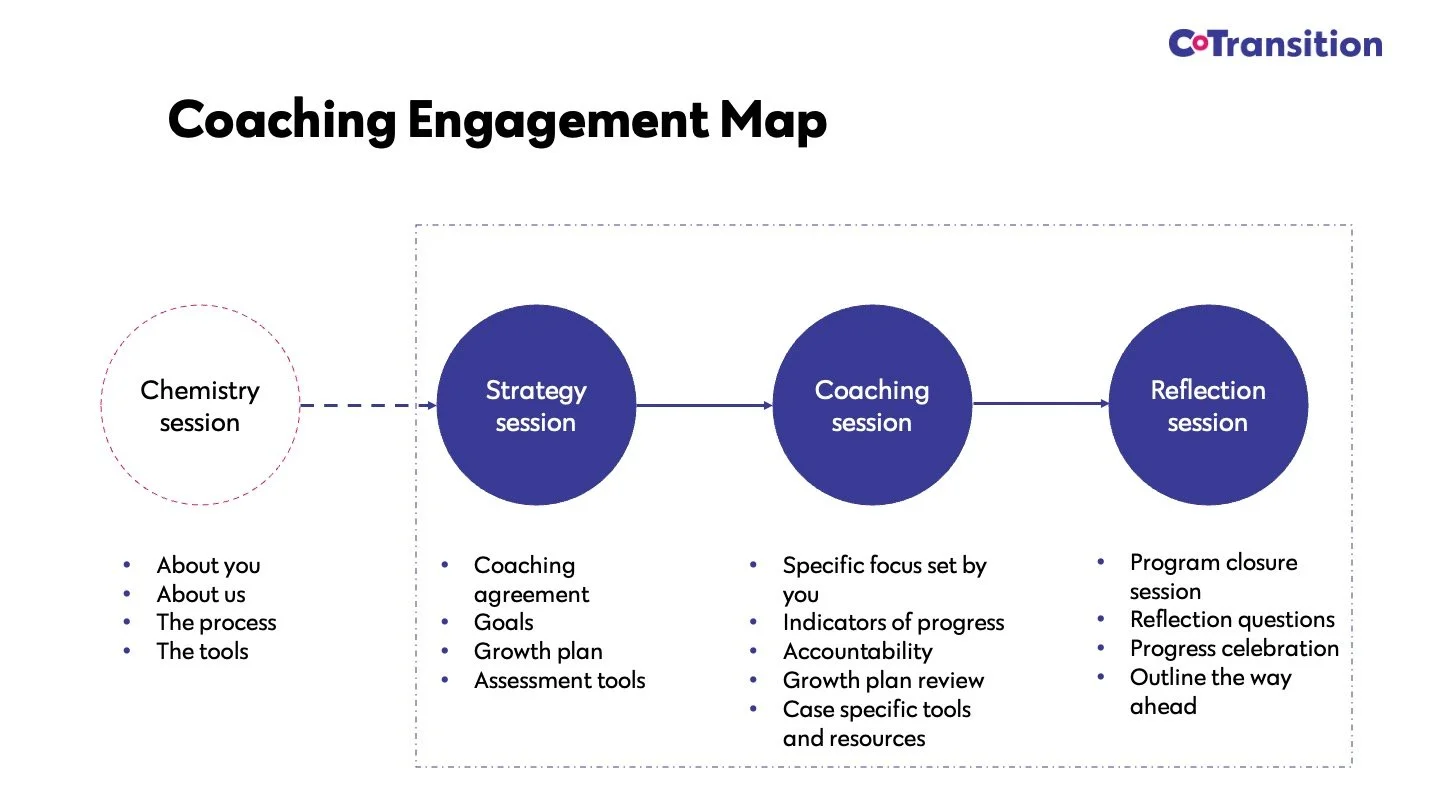 The engagement may draw on various resources including tools, assessments, videos, books, and articles. Mentorship and feedback are woven throughout. The process follows the fundamentals of good coaching: goal setting, strategies, actions, and regular review.